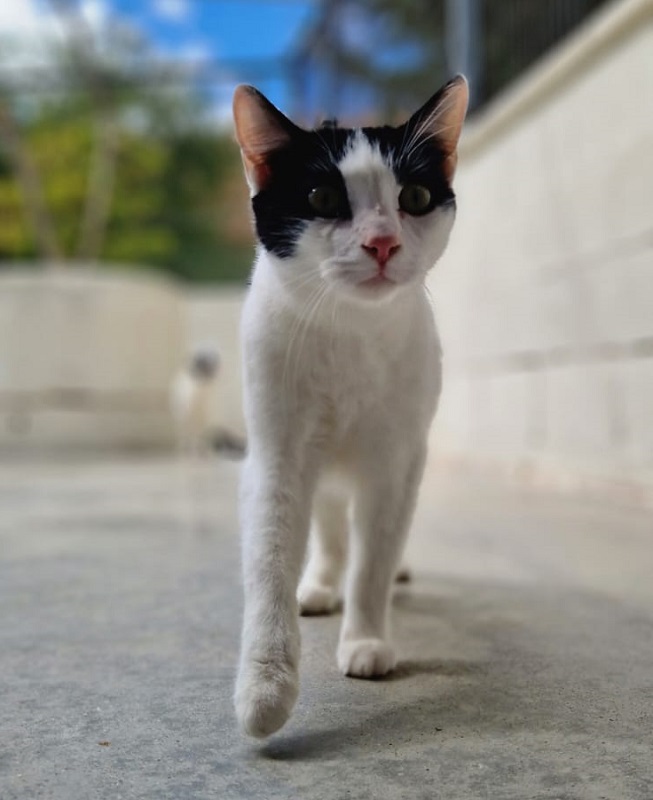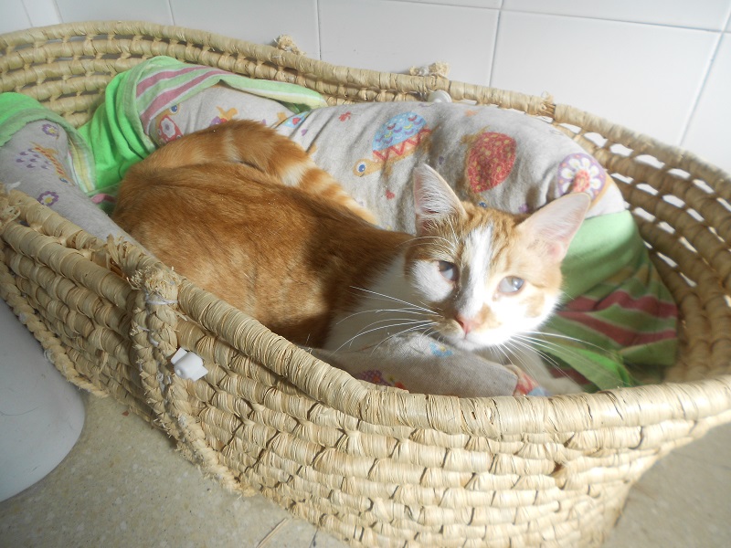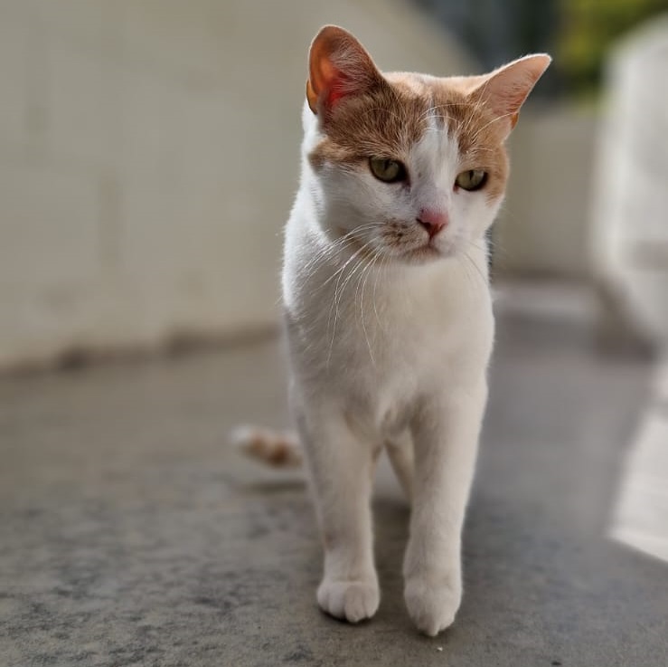 Procede de un poblado chabolista. Tiene Ataxia (movimientos descoordinados ,ligeros temblores…) Necesita mayor atención, aunque los cuidados son muy parecidos a un gato normal.