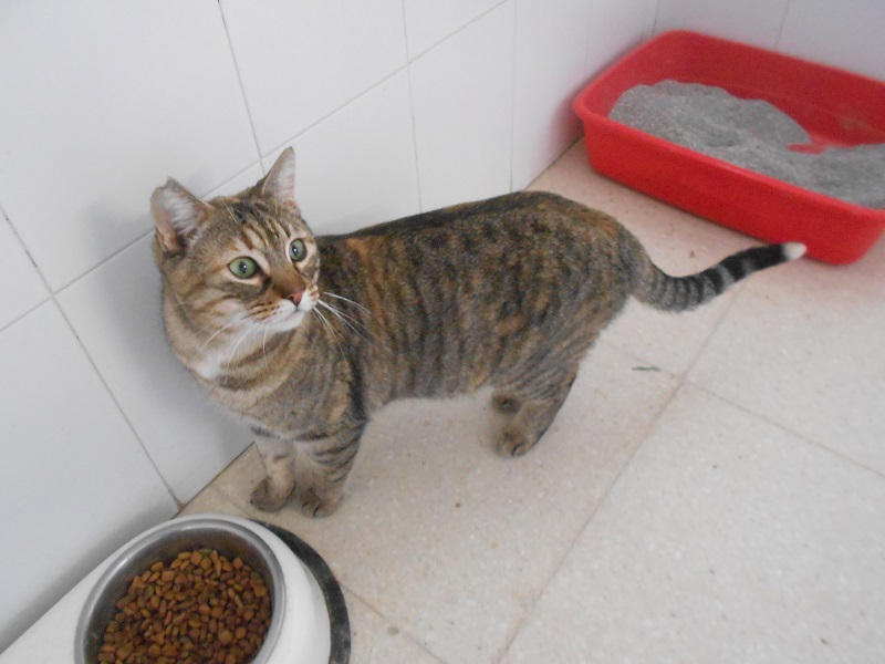 Muy buena y cariñosa. Le encantan los juegos. Necesita compañía humana o de otros gatos, por su comportamiento parece un abandono ya que se observa conductas de gata casera tanto en el contacto con personas como con otros gatos.